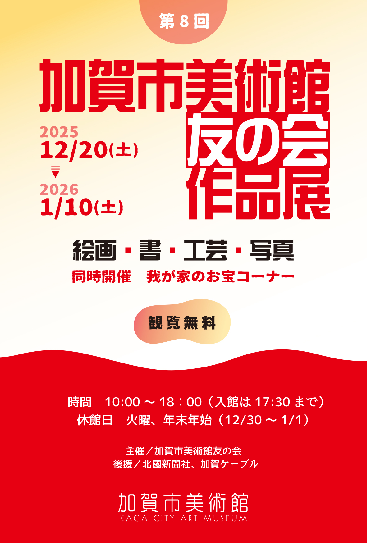 展覧会 開催中の展覧会 加賀市美術館 名品展 2025年 11月14日(金) ~ 2026年 1月12日(月) 今後の展覧会 加賀市小中学校図工美術作品展 2025年 11月21日(金) ~ 11月24日(月) 今後の展覧会 やまなか漆器クラブ作品展 2025年 11月21日(金) ~ 11月24日(月) 今後の展覧会 加賀市絵画クラブ 選抜展 2025年 12月7日(日) ~ 12月14日(日) 今後の展覧会 写真協会の撮影旅行写真展 2025年 12月12日(金) ~ 12月22日(月) 今後の展覧会 第8回 加賀市美術館友の会 作品展 2025年 12月20日(土) ~ 2026年 1月10日(土) カレンダー 開館時間10:00~18:00 (入館は17:30まで) 休館日火曜日(祝日は営業) ※展示替えによる臨時休館日あり 年末年始 12月30日~1月1日 展覧会の一覧 お知らせ 2025.10.10 11月 臨時休館のお知らせ 2025.10.03 【文化の日】11/3(月)観覧無料 2025.10.01 【いしかわ文化の日】10/19(日)石川県民観覧無料 2025.09.07 10月 臨時休館のお知らせ 2025.08.01 講演会「魯山人前夜」 お知らせ一覧 加賀市美術館のご案内 来館のご案内 施設のご案内 友の会 Facebook 加賀市美術館 X(旧 Twitter) Tweets by kagabi02