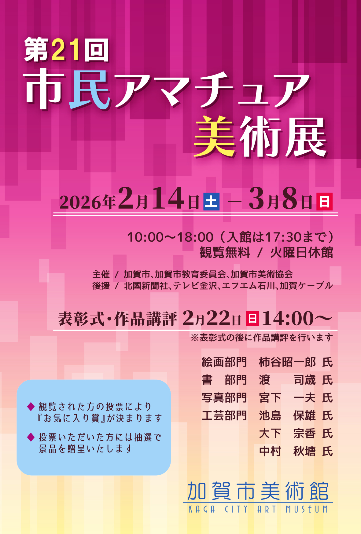 展覧会 開催中の展覧会 硲伊之助の「絵画」 2026年 1月16日(金) ~ 3月1日(日) 今後の展覧会 第21回 市民アマチュア美術展 2026年 2月14日(土) ~ 3月8日(日) カレンダー 開館時間10:00~18:00 (入館は17:30まで) 休館日火曜日(祝日は営業) ※展示替えによる臨時休館日あり 年末年始 12月30日~1月1日 展覧会の一覧 お知らせ 2026.01.16 空調設備の修理完了のお知らせ 2026.01.07 空調設備の故障について 2026.01.05 第21回 市民アマチュア美術展 作品募集 2025.12.08 アビオシティ加賀2F連絡通路工事に伴う通行止めのお知らせ 2025.11.30 年末年始休館のお知らせ お知らせ一覧 加賀市美術館のご案内 来館のご案内 施設のご案内 友の会 Facebook 加賀市美術館 X(旧 Twitter) Tweets by kagabi02