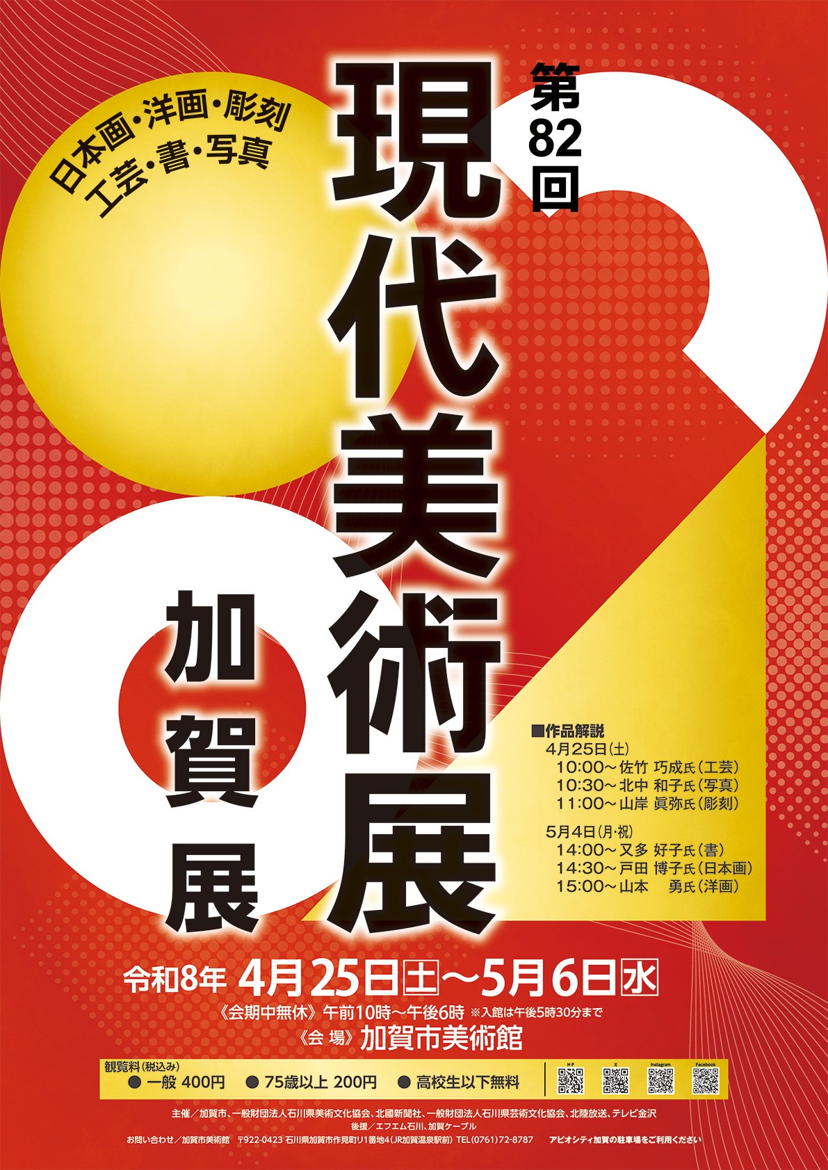 展覧会 開催中の展覧会 第21回 KAGAフォト展 2026年 4月9日(木) ~ 4月19日(日) 開催中の展覧会 加賀市美術館 名品展 2026年 3月6日(金) ~ 4月20日(月) 今後の展覧会 第82回 現代美術展 加賀展 2026年 4月25日(土) ~ 5月6日(水) カレンダー 開館時間10:00~18:00 (入館は17:30まで) 休館日火曜日(祝日は営業) ※展示替えによる臨時休館日あり 年末年始 12月30日~1月1日 展覧会の一覧 お知らせ 2026.03.12 アビオシティ加賀2F連絡通路工事に伴う通行止めのお知らせ(アビオシティ加賀 休館の場合について) 2026.01.16 空調設備の修理完了のお知らせ 2026.01.07 空調設備の故障について 2026.01.05 第21回 市民アマチュア美術展 作品募集 2025.12.08 アビオシティ加賀2F連絡通路工事に伴う通行止めのお知らせ お知らせ一覧 加賀市美術館のご案内 来館のご案内 施設のご案内 友の会 Facebook 加賀市美術館 X(旧 Twitter) Tweets by kagabi02