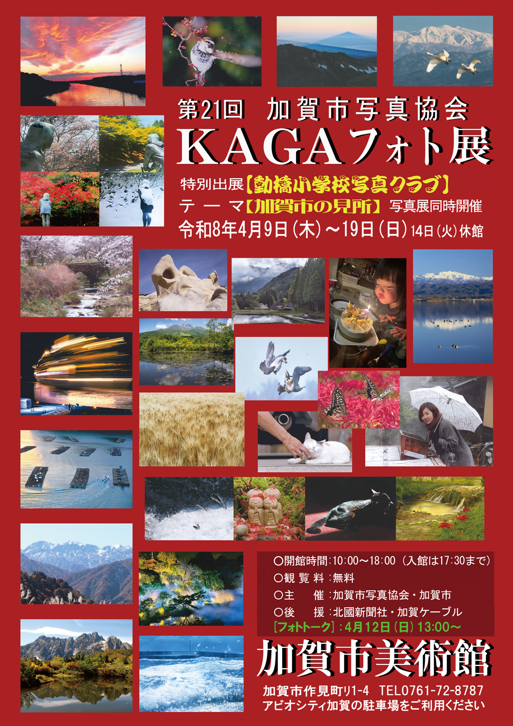 展覧会 開催中の展覧会 加賀市美術館 名品展 2026年 3月6日(金) ~ 4月20日(月) 今後の展覧会 わたり書道塾 作品展 2026年 3月28日(土) ~ 3月29日(日) 今後の展覧会 第21回 KAGAフォト展 2026年 4月9日(木) ~ 4月19日(日) カレンダー 開館時間10:00~18:00 (入館は17:30まで) 休館日火曜日(祝日は営業) ※展示替えによる臨時休館日あり 年末年始 12月30日~1月1日 展覧会の一覧 お知らせ 2026.03.12 アビオシティ加賀2F連絡通路工事に伴う通行止めのお知らせ(アビオシティ加賀 休館の場合について) 2026.01.16 空調設備の修理完了のお知らせ 2026.01.07 空調設備の故障について 2026.01.05 第21回 市民アマチュア美術展 作品募集 2025.12.08 アビオシティ加賀2F連絡通路工事に伴う通行止めのお知らせ お知らせ一覧 加賀市美術館のご案内 来館のご案内 施設のご案内 友の会 Facebook 加賀市美術館 X(旧 Twitter) Tweets by kagabi02