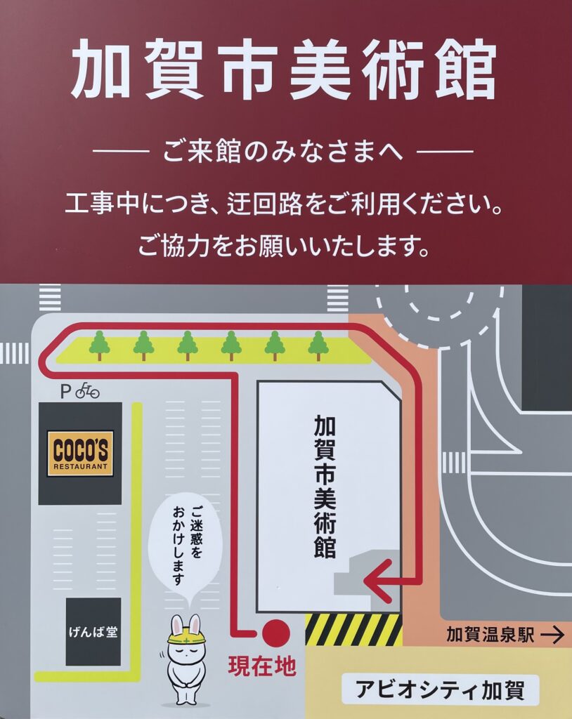 アビオシティ加賀2Fの工事に伴う通行止めについてですが、2026年3月12日(木)と4月9日(木)はアビオシティ加賀さんがお休みのため、駐車場から当館へのルートが変更となります。